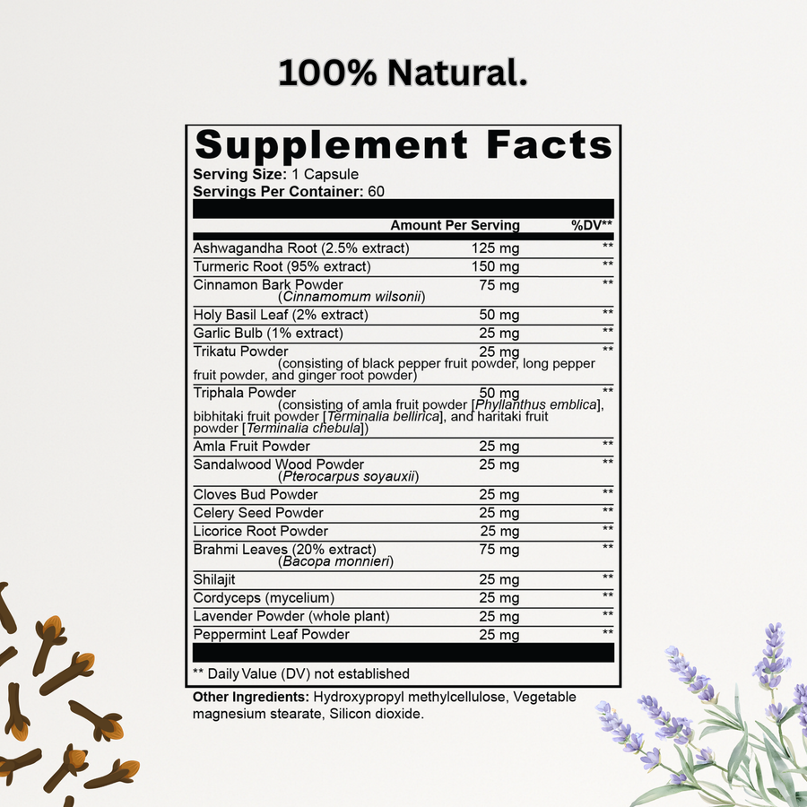 • Polyphenols & phytonutrients — Turmeric, Triphala, Cinnamon for oxidative stress reduction and digestive support.